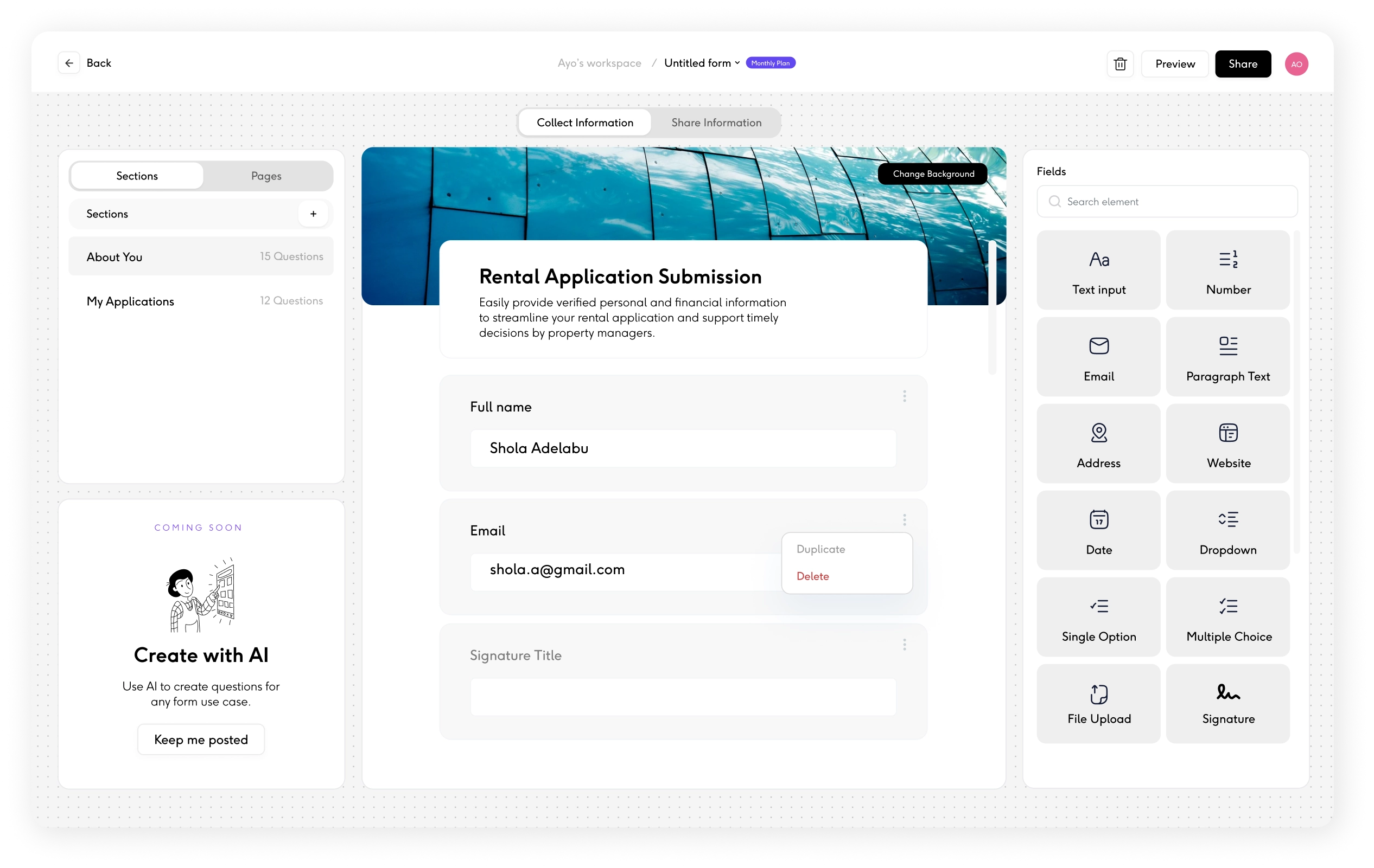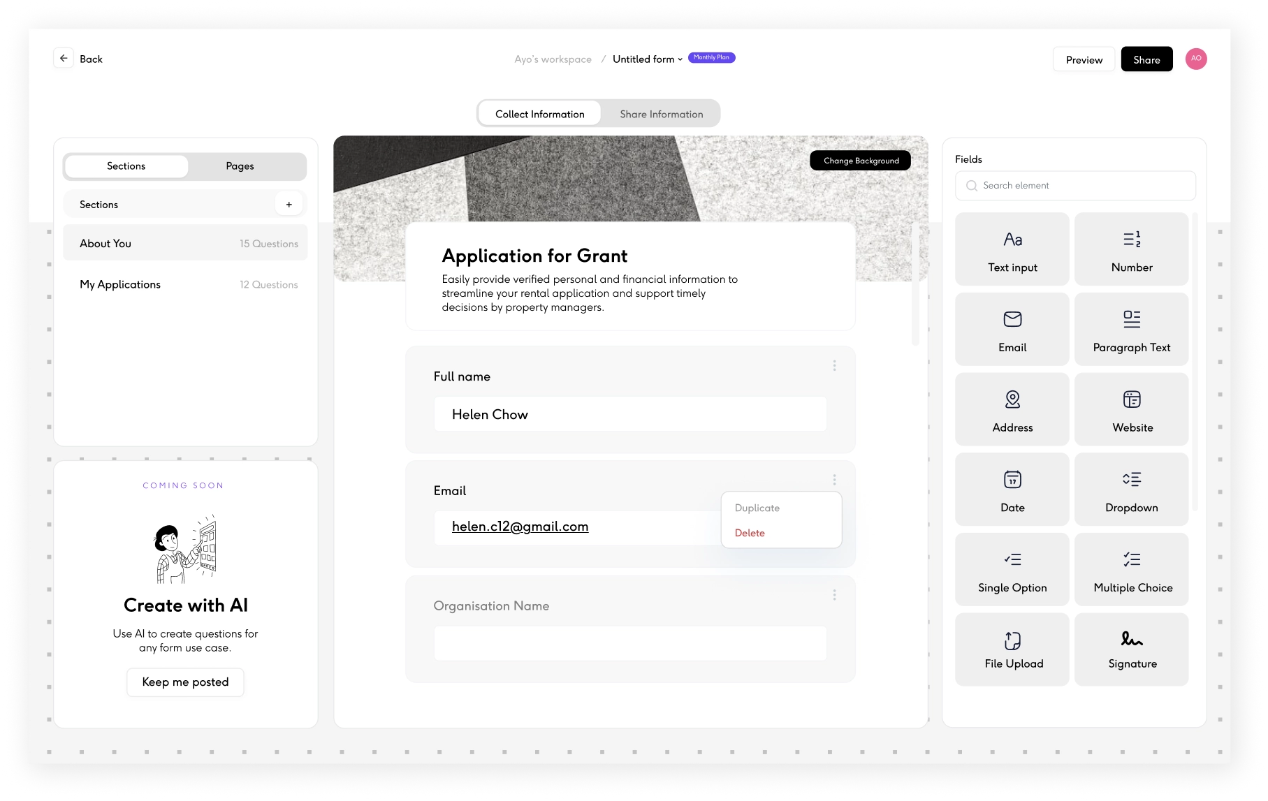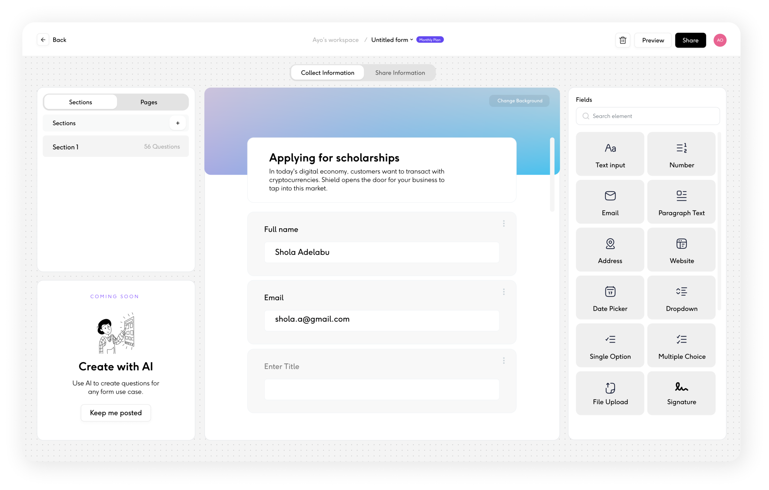 Build from scratch or select from pre-designed templates and customize them to suit your needs. Whether you’re collecting applications, onboarding details, or documents, templates help you get started fast, without building from scratch.